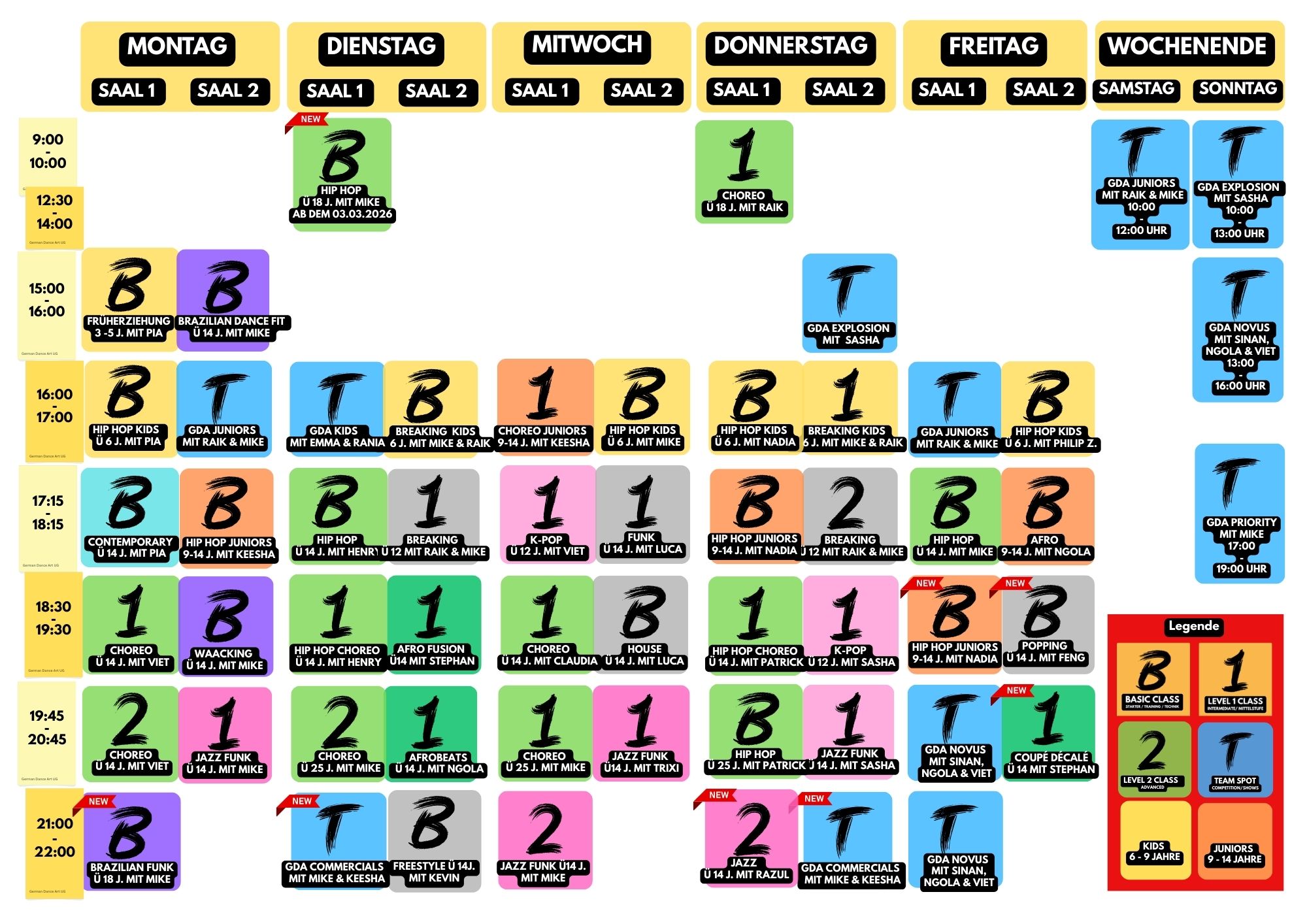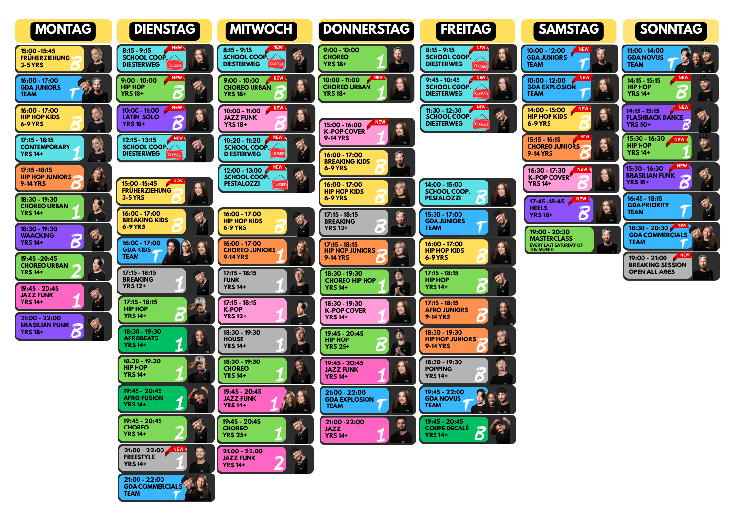 Die Basickurse sind perfekt für den Einstieg in die Welt des Tanzens! Coole Basics zu aktueller Chartmusik. Für alle, die noch keine Erfahrung haben oder den Wiedereinstieg versuchen. Diese Kurse fördern unter anderem die körperliche Fitness. Hier werden grundsätzlich die Basics der jeweiligen Stile erarbeitet und Choreographie mindestens 3 Wochen unterrichtet. Hier werden keine Classvideos gedreht. Maximal kurze Eindrücke medial dokumentiert.